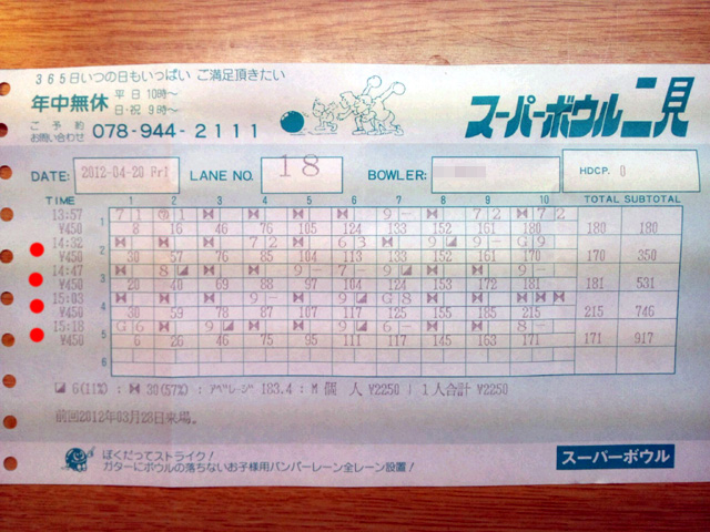 | 6 | ひでぃ | 828 | 17 | 65 | 0 | 殊勲、ノーミスx1、敢闘、最大ローハイ差、最多スペア、上等勝利者 |