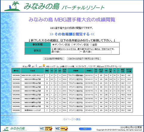 「MBG選手権大会の成績を閲覧する」ボタンを押すと、成績検索ページに移ります。